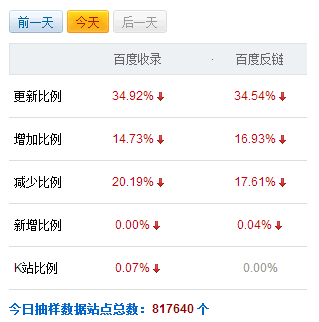 后來我查了下SEO數(shù)據(jù)風(fēng)向標(biāo),發(fā)現(xiàn)今天的百度的數(shù)據(jù)風(fēng)向標(biāo)全部下滑。從圖中可以看出,百度的收錄、反鏈幾乎全線下降,我順帶查了查其他站。